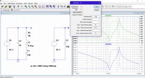 Na rysunku 4 pokazano wynik symulacji „AC Analysis”. Domyślnie obliczane jest napięcie lub natężenie prądu we wskazanej gałęzi lub elemencie. Aby uzyskać wykres impedancji konieczne jest przedefiniowanie mierzonego parametru, np. wprowadzenie wyrażenia V(a)/I(V1) pozwala obliczyć impedancję rezonatora. Jak widać wyniki uzyskane z symulatora potwierdzają rozważania o dwóch rezonansach. Pojemność Cmont symbolizuje pojemności montażowe.