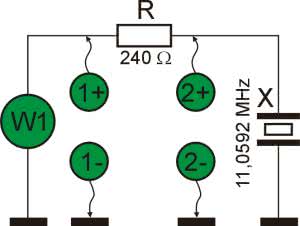 Rezystor R służy do pomiaru prądu płynącego w obwodzie. Prąd jest obliczany w programie na podstawie pomiaru spadku napięcia na znanej rezystancji. Napięcie na rezystorze jest równe różnicy napięć mierzonych przez 1. i 2. kanał przyrządu. Rezystor powinien być dobierany w zależności od rezystancji mierzonego elementu. Impedancja rezonatora zmienia się jednak w dość dużym zakresie, konieczny jest jakiś kompromis. Rezystor 240 Ω powinien być dobrym wyborem.