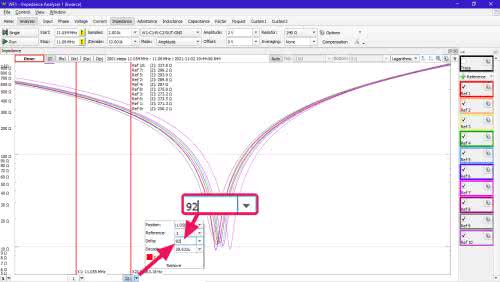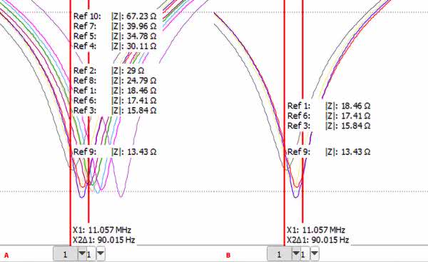Tym razem w narzędziu Impedance wprowadzamy zakres częstotliwości od 11,054 MHz do 11,06 MHz. Pozostawiamy 2001 punktów pomiarowych, Kompensujemy układ tak jak robiliśmy to wcześniej i przystępujemy do pomiarów. Do obwodu pomiarowego wkładamy pierwszy rezonator i uruchamiamy pojedynczy pomiar. Po chwili uzyskujemy wykres, który zapamiętujemy uruchamiając opcję +Reference → Add Trace as Reference. Wkładamy kolejny rezonator i po skończonym pomiarze ponownie zapamiętujemy jego parametry.
