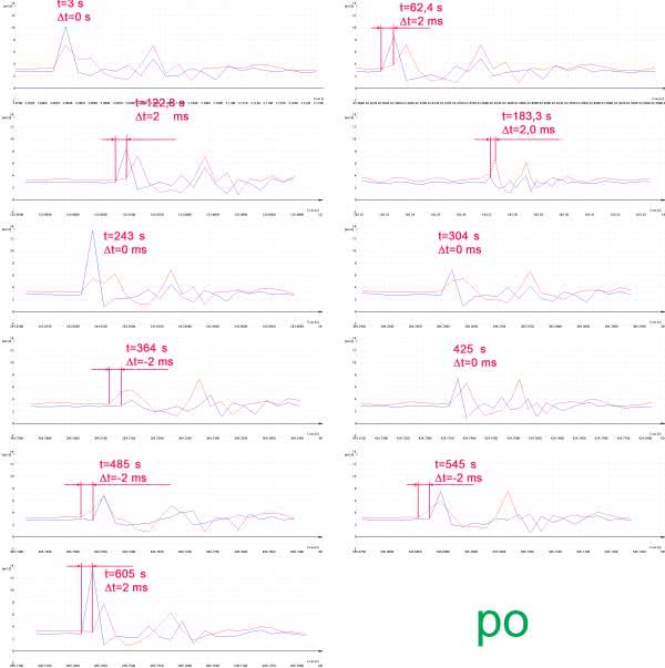 Wyniki testów zostały pokazane na rysunkach 11 i 12. Przed wlutowaniem dobranych rezonatorów przeprowadzono pomiary z rezonatorami, które pierwotnie znalazły się w rejestratorach i nie były dobierane. O tym, że problem został wcześniej całkowicie zignorowany świadczy fakt, że w jednym urządzeniu był kwarc 11,0592 MHz, a w drugim 11,059 MHz. W czasie testu rejestry były połączone ze sobą mechanicznie i rejestrowały bodźce mechaniczne pobudzające oba urządzenia jednocześnie. Po wykonaniu pomiaru trwającego nieco ponad 10 minut program komputerowy odczytał dane z urządzeń i na wszelki wypadek przeprowadził ich synchronizację polegającą na dosunięciu obu wykresów tak, aby pierwsze impulsy zaczynały się dokładnie w tej samej chwili czasowej. Sygnały były próbkowane z częstotliwością 500 Hz, a więc początkowy asynchronizm w najgorszym przypadku mógł być równy 2 ms.