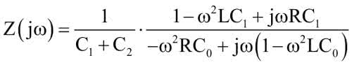 Można spodziewać się, że charakterystyka częstotliwościowa impedancji rezonatora będzie miała minimum dla częstotliwości rezonansowej. Z pewnością byłoby tak, gdyby nie było pojemności C2. Występowałby wówczas tylko rezonans szeregowy na częstotliwości drgań rezonatora. Pojemność C2 powoduje jednak, że w obwodzie z rezonatorem wystąpi również rezonans równoległy dla częstotliwości, dla której reaktancja indukcyjności L1 zmniejszona o reaktancję pojemności C1 będzie równa co do modułu reaktancji pojemności C2. Nie jest to jednak częstotliwość pracy kwarcu. Rezonans równoległy spowoduje, że w wykresie impedancji oprócz minimum dla rezonansu szeregowego pojawi się maksimum dla rezonansu równoległego. Impedancja rezonatora o takim modelu jest równa: