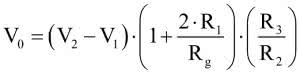 W ten sposób na oporniku Rg rozpięte jest pełne napięcie różnicowe (ponieważ A1 i A2 to bufory o jednostkowym wzmocnieniu). Dzięki temu zmieniając wartość Rg – pojedynczego opornika, można zmieniać wartość wzmocnienia dla sygnału różnicowego całego układu. Ma to tę zaletę, że po dobraniu wartości oporników R1, R2 i R3, tak, aby były one, odpowiednio, takie same, nie ma konieczności precyzyjnego dobierana wartości elementów dyskretnych między sobą. W takim układzie napięcie wyjściowe równe jest równe: