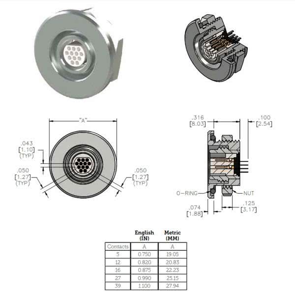 Szczelne złącza skręcane Micro 360 marki Omnetics występują w wersjach o liczbie pinów równej 5, 7, 12, 16, 27 oraz 39, a klasa szczelności dochodzi nawet do IP67. Komponenty mogą pracować w szerokim zakresie temperatur otoczenia (od –55°C do 125°C) i oferują amperaż do 3 A. Dzięki gęstemu ułożeniu macierzy styków największe złącze (39 pin) ma zewnętrzną średnicę (w przypadku modelu z kołnierzem do mocowania na panelu) poniżej 28 mm (rysunek 2).