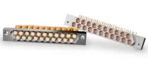 - Złącza multi-coax umożliwiają zmniejszenie konstrukcji i uproszczenie obsługi systemów korzystających z dużej liczby standardowych (pojedynczych) złączy koncentrycznych. Dobrym przykładem mogą być tutaj rozmaite systemy przeznaczone do celów naukowych (szybka akwizycja danych w wielu kanałach) lub telekomunikacyjnych – nietrudno domyślić się, jak uciążliwy i narażony na błędy operatora byłby przegląd lub serwis systemu, w którym wykorzystywanych byłoby kilkanaście, a nawet kilkadziesiąt konwencjonalnych złączy koncentrycznych (np. BNC lub SMA). Zastosowanie złączy zawierających wiele sekcji we wspólnej obudowie i pod-/odłączanych w ramach pojedynczej operacji stanowi niebywałe ułatwienie dla konstruktorów, serwisantów oraz użytkowników takich systemów. Doskonałym przykładem komponentów z omawianej grupy mogą być – umieszczone znów w obudowie typu D-SUB – złącza z rodzin MDCX i MDHC marki Smiths Interconnect (fotografia 3) – w zależności od wybranej wersji, elementy te mogą pracować z sygnałami o paśmie do 10, 30, a nawet 40 GHz (!) i napięciem do 125 Vrms (przy częstotliwości 5 MHz). Impedancja charakterystyczna pojedynczej sekcji to standardowe 50 Ω. Złącza występują w wersjach o 2, 4, 6, 8, lub 10 niezależnych torach sygnałowych, a „raster” (tj. rozstaw mierzony pomiędzy środkami sąsiadujących sekcji) wynosi 176 mils. Ten sam producent opracował zresztą także analogiczne, 100- i 150-omowe złącza z sekcjami typu twinax (fotografia 4).
