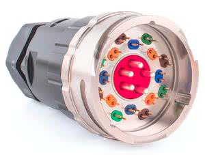 Innym przykładem złączy należących do omawianej kategorii są komponenty z serii SGH włoskiej marki Valentini (fotografia 9). Te solidne, okrągłe złącza z mocowaniem bagnetowym zawierają nie tylko zestaw par typu twinax (do obsługi połączeń ethernetowych), ale także dodatkowy, środkowy wkład, zawierający 3/5 pinów zasilających bądź dwanaście styków sygnałowych dla transmisji DMX/AES (choć istnieje możliwość zaślepienia otworu wkładką pozbawioną styków). Seria jest przeznaczona głównie do zastosowań scenicznych.