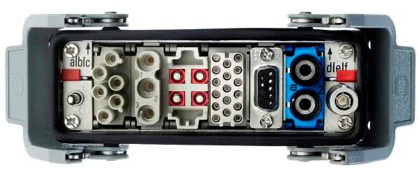 Zdecydowanie najbardziej elastyczną i różnorodną grupą produktów są złącza hybrydowe o w pełni konfigurowalnej konstrukcji. Co prawda także w tym przypadku mamy do czynienia z pewnym systemem gotowych, znormalizowanych korpusów oraz wszelkich przeznaczonych do nich akcesoriów (uszczelek, dławnic, elementów mechanicznych, itd.), jednak najważniejsza część złącza – wkład izolacyjny ze stykami oraz ewentualnymi złączkami pneumatycznymi bądź hydraulicznymi – jest składana przez użytkownika niczym z „klocków”. Taka konstrukcja zapewnia znaczącą dozę dowolności w wyborze liczby i rodzaju połączeń, dzięki czemu pojedyncza para wtyk-gniazdo może jednocześnie obsługiwać wszystkie wymienione na początku artykułu rodzaje sygnałów oraz mediów.