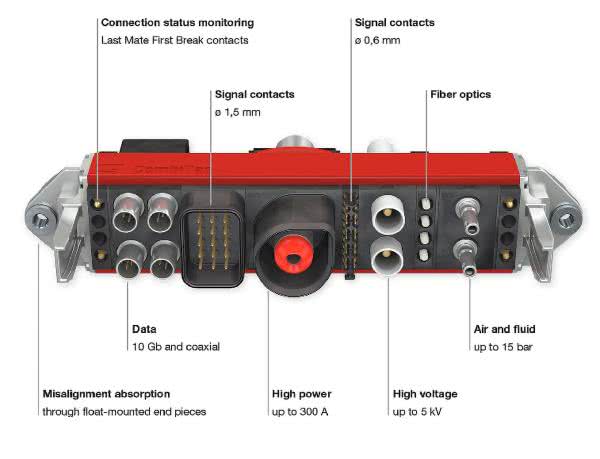 Podobne rozwiązania wdrażają także inni producenci. Firma Staubli opracowała dwie własne serie złączy modułowych: CombiTac uniq™ oraz CombiTac direqt™. Pierwsza z nich – najbardziej zaawansowana technologicznie – obsługuje jednocześnie połączenia zasilania, przekaz sygnałów cyfrowych/analogowych, transmisję danych oraz sygnałów radiowych (RF) z wykorzystaniem sekcji koncentrycznych, a także – co ciekawe i dość unikalne – połączenia światłowodowe. Co więcej, niektóre moduły pozwalają na podłączenie termopar (poprzez specjalne pary styków kompensacyjnych), inne zaś obsługują transport sprężonych gazów oraz… cieczy (i to aż do 15 bar). Nie zabrakło nawet 5-kilowoltowych styków wysokonapięciowych, 300-amperowych (!) łączy wysokoprądowych oraz modułów typu twinax, przeznaczonych do transmisji danych z prędkością nawet 10 Gb. Specjalne piny umieszczone po bokach obudowy umożliwiają monitorowanie statusu połączenia gniazda z wtykiem i – w przeciwieństwie do opisanych wcześniej styków uziemiających – łączą się ze sobą jako ostatnie, zaś rozłączają – jako pierwsze. Rozwiązanie takie umożliwia konstruktorom uzyskanie całkowitej kontroli nad procesem łączenia dwóch części urządzenia, co może znacząco zwiększyć niezawodność całego systemu. Przykładowe złącze wraz z opisem poszczególnych sekcji pokazano na fotografii 13.