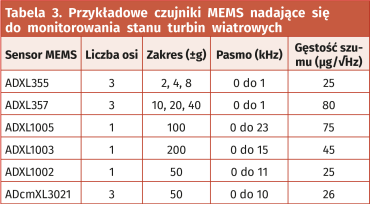 Spełnienie wszystkich wymagań dotyczących parametrów, zasięgu i gęstości spektralnej szumu dla monitorowania drgań w zastosowaniach turbin wiatrowych można łatwo osiągnąć za pomocą czujników MEMS takich jak ADXL1002, ADXL1003, ADXL1005 czy ADcmXL3021 (tabela 2).