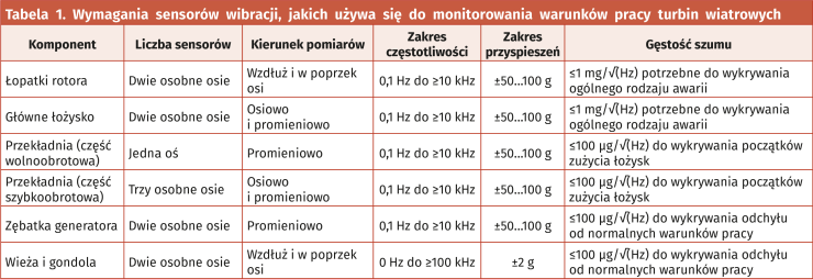 Stosunkowo duża zawodność elementów przekładni doprowadziła do położenia największego nacisku na monitorowanie stanu elementów przekładni oraz jej łożysk i wałów. Na rynku dostępnych jest wiele systemów monitorowania stanu turbin wiatrowych, z których większość jest ukierunkowana na analizę stanu przekładni za pomocą pomiaru ich drgań. Natomiast systemów monitorowania łopat wirnika istnieje niewiele, ale jest to obszar ciągłych eksperymentów. Wiele badań popiera stosowanie systemów monitorowania drgań w turbinach wiatrowych, są to m.in. szczegółowe pomiary i analizy korzyści płynących z implementacji różnych systemów. Mniej szczegółowo omówiono wymagania dotyczące czujników drgań w zastosowaniach do innych elementów turbin wiatrowych. Poniższy artykuł zawiera informacje o systemie monitorowania komponentów turbin wiatrowych, statystyki awarii, typowe rodzaje awarii i metody gromadzenia danych o tych awariach. Wymagania dotyczące czujników drgań, takie jak szerokość pasma, zakres pomiarowy i gęstość szumów, zostały omówione w dalszej części tekstu w odniesieniu do typowych elementów turbin wiatrowych, ale wiedzę tę można przenieść na inne rodzaje układów mechanicznych.