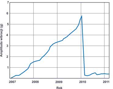 Czujnik o poziomie szumów od 100..200 μg/√Hz ma wystarczające parametry do rejestrowania normalnych warunków pracy łożyska, a także doskonale nadaje się do pomiaru objawów awarii na wczesnym ich etapie w zakresie mg/√Hz. W rzeczywistości zastosowanie czujnika MEMS z poziomem szumu 100 μg/√Hz umożliwia jeszcze wcześniejsze wykrywanie uszkodzeń łożysk. Podczas gdy początkowe uszkodzenie łożyska występuje przy wartości mniejszej niż 0,1 g, zaawansowane sygnatury uszkodzenia łożyska zwykle pojawiają się przy wartościach około 1 g, co powinno już oznaczać konieczność przeprowadzenia serwisu systemu. Na rysunku 5 pokazano, że konserwacja przekładni i wymiana łożyska może nastąpić, gdy amplituda drgań przekracza 6 g. Jak wspomniano wcześniej, harmoniczne uszkodzeń łożysk występują przy wyższych częstotliwościach. Pomiary o wyższej częstotliwości wymagają czujnika o większym zakresie przyspieszeń. Dzieje się tak, ponieważ zmierzona siła przyspieszenia g jest proporcjonalna do kwadratu częstotliwości. Tak więc małe przemieszczenie przy wyższej częstotliwości skutkuje szerszym zakresem g w porównaniu z tym samym przemieszczeniem przy niskiej częstotliwości. Czujniki o większej szerokości pasma, z zakresem pomiarowym do 10 kHz, są zazwyczaj specyfikowane dla zakresu od 50 g do 200 g – idealnie do zastosowań w turbinach wiatrowych. Czujnik drgań musi również uwzględniać warunki obciążenia udarowego spowodowane uderzeniem lub nagłym pęknięciem elementów. W rezultacie typowe komercyjne systemy monitorowania drgań są przeznaczone do pracy z przyspieszeniem do co najmniej 50 g lub nawet 100 g. W przypadku głównego łożyska turbiny wiatrowej wymagany jest co najmniej jeden jednoosiowy sensor drgań, a rekomendowane są dwa, do pomiaru w dwóch osiach – zgodnie z kierunkiem osi oraz promieniowo do osi. Pęknięcia osiowe w bieżniach łożysk mogą skrócić żywotność łożyska do zaledwie jednego lub dwóch lat, więc ich szybkie wykrywanie pozwala na szybki serwis systemu i uniknięcie dalszych, większych kosztów.