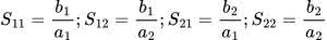 Wewnętrzna odpowiedź sieci może być następnie wyrażona przez grupowanie parametrów S razem w macierz rozpraszania (macierz S), która wiąże złożone wielkości fal na wszystkich portach analizowanego układu. Dla sieci dwuportowej niezrównoważonej relacja bodziec–odpowiedź przyjmie postać, jaką pokazano w równaniu 2.