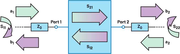Wielkości falowe aX, schematycznie pokazane na rysunku1, są złożonymi amplitudami fal napięcia, które padają na Port 1 i Port 2 urządzenia. Jeśli jeden port w danym momencie jest pobudzany pewną mocą – a1 lub a2, gdy drugi port jest podłączony do dopasowanego obciążenia, można zdefiniować odpowiedź układu do przodu i do tyłu (względem urządzenia) w postaci fal oznaczonych odpowiednio b1 oraz b2. Wielkości te reprezentują fale radiowe odbite lub przesyłane przez porty sieci. Jeśli obliczymy stosunek wynikowych odpowiedzi złożonych i początkowych wielkości bodźca, możemy zdefiniować parametry S komponentu dwuportowego, jak pokazano w równaniu 1.