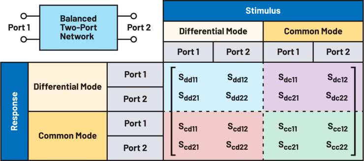Do tej pory parametry S definiowane były dla typowego przykładu pomiaru układu z sygnałami asymetrycznymi (common). W układach takich sygnał bodźca, jak i odpowiedzi odnoszą się do poziomu masy. Jednak dla komponentów symetrycznych (differential), które wyposażone są w porty różnicowe, ta definicja nie jest wystarczająca. Zrównoważone sieci wymagają szerszego podejścia do charakteryzowania, które muszą być w stanie w pełni opisać ich odpowiedzi w pomiarze różnicowym i we wspólnym. Można to osiągnąć za pomocą parametrów S trybu mieszanego. Rysunek 2 pokazuje przykład parametrów rozpraszania mierzonych w trybie mieszanym zgrupowanych razem w rozszerzoną macierz S reprezentującą typowy dwuportowy komponent różnicowy.