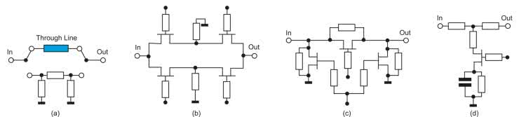 Z kolei układy DSA zazwyczaj zawierają wiele połączonych ze sobą kaskadowo jednostek reprezentujących poszczególne bity, które można włączać i wyłączać, aby osiągnąć wymagany poziom tłumienia. Kilka przykładów konfiguracji stosowanych w urządzeniach typu DSA pokazano na rysunku 4. Obejmują one konfiguracje ze zintegrowanymi przełącznikami SPDT, które przełączają porty wejściowe i wyjściowe z tłumikiem i obejściem, projekty urządzeń z przełączaną skalą z tranzystorami lub diodami używanymi, jako przełączane rezystancje, a także konfigurację z przełączanym rezystorem, w której rezystory mogą być włączane lub wyłączane z obwodu; pokazana jest także konstrukcja typu wbudowanego w urządzenie z tranzystorem lub diodą, jako integralną częścią tłumika.