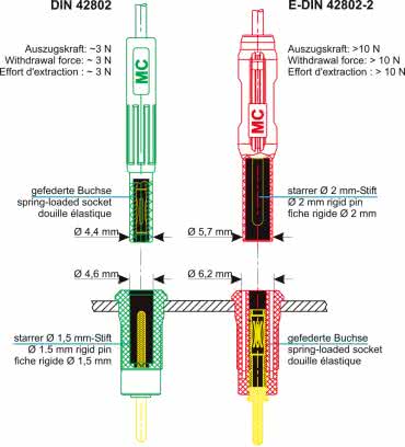 Wtyki touch-proof są powszechnie spotykane m.in. w aparaturze EEG, gdzie – z uwagi na niewielkie wymiary i masę oraz dużą liczbę używanych elektrod – zastosowanie niewielkich wtyków i gniazd jest wysoce pożądane z praktycznego punktu widzenia. Przykładowe przewody zakończone tego typu złączami zostały pokazane na fotografii 22, zaś rysunek 1, zaczerpnięty z katalogu marki Multi-Contact (grupa Stäubli), pozwala zapoznać się z różnicami konstrukcyjnymi pomiędzy najczęściej spotykanymi złączami, określanymi potocznie jako 1,5-milimetrowe (i oznaczanymi w katalogach jako DIN 42802) oraz 2-milimetrowe (E-DIN 42802-2).