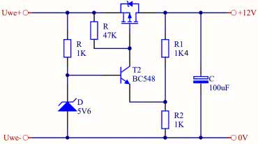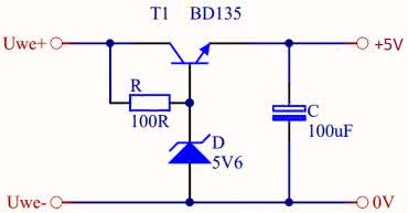 Na rysunku 1 został pokazany prosty stabilizator napięcia z diodą Zenera i tranzystorem bipolarnym. Zasadniczą wadą takiego rozwiązania jest duża wartość spadku napięcia na tranzystorze (drop out voltage), która może wynosić 1 V i więcej. Na rysunku 2 został pokazany układ stabilizatora, w którym zastosowano tranzystor MOSFET z kanałem N i dzięki temu uzyskano bardzo niską wartość parametru drop out. Jako tranzystor MOSFET można zastosować dowolny tranzystor niskonapięciowy np. IRF9530.