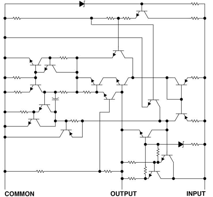 Znaki XX w symbolu układu scalonego oznaczają napięcie wyjściowe. Schemat wewnętrzny został pokazany na rysunku 6. Układy te dostępne są w niemal wszystkich typach obudów zarówno przewlekanych, jak i SMD.