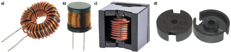 Rdzenie w dławikach mogą mieć różne kształty. Najczęściej stosowane są rdzenie kubkowe, osiowe, pierścieniowe lub EE - fotografia 1. Dławiki pionowe lub osiowe stosuje się dla stosunkowo małych indukcyjności. W zasilaczach impulsowych dużej mocy najczęściej stosuje się dławiki pierścieniowe z rdzeniem proszkowym. Materiał ten ma dużą maksymalną indukcję i bardzo dobrze nadaje się do tego celu. Ponadto ma niewielką przenikalność magnetyczną dzięki czemu można uzyskać dużą wartość natężenia pola magnetycznego bez konieczności stosowania szczeliny.