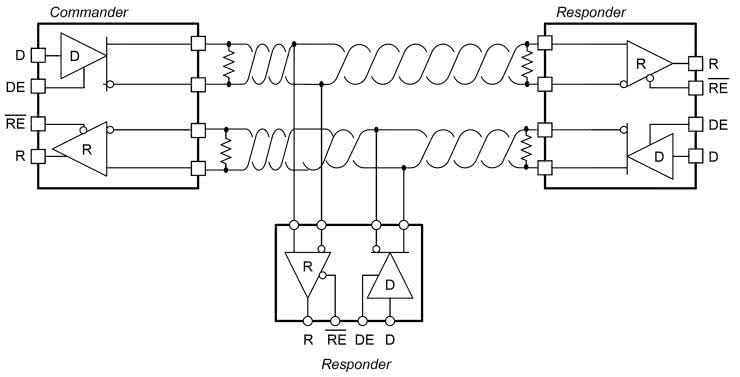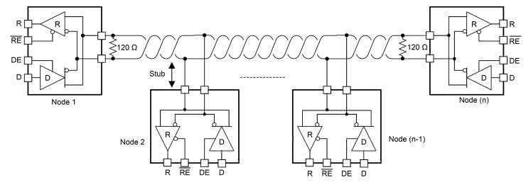 Na rysunkach 1 i 2 zostały pokazane typowe sieci RS-485 odpowiednio w konfiguracji full-duplex oraz half-duplex. W tych obu topologiach drivery, odbiorniki i transceivery biorące udział w komunikacji łączą się z głównym łączem kablowym za pośrednictwem tzw. końcówek sieciowych (stub). Odgałęzienia te to odległość elektryczna między transceiverem a magistralą kablową i zasadniczo reprezentuje fragment linii magistrali bez terminacji.