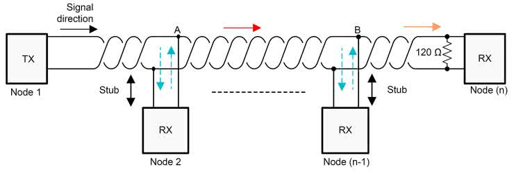 Sygnał elektryczny wędruje przewodami (medium fizyczne) od drivera do wszystkich odbiorników w sieci. Podczas sterowania siecią impedancja wyjściowa sterownika (TX) jest niska, podczas gdy impedancja wejściowa odbiornika (RX) jest zwykle wysoka (na poziomie kΩ). Jak pokazano na rysunku 3, za każdym razem, gdy sygnał napotyka niedopasowanie impedancji, takie jak odgałęzienia węzłów środkowych (w punktach A i B) lub piny wejściowe odbiornika (w węźle n), pewna ilość sygnału jest odbijana w przewodzie, co zakłóca sygnał i pogarsza jakość transmisji. Współczynnik odbicia (r) jest opisany równaniem 1.
