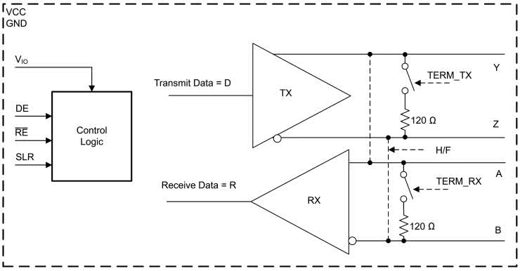 Układ może być używany w sieciach RS-485 typu half-duplex lub full-duplex, konfiguracja realizowana jest pinem H/F. Pin SLR układu służy do kontroli szybkości narastania. Może służyć do ustawienia urządzenia w trybie maksymalnej prędkości – 20 Mb/s – lub w trybie ograniczonej szybkości narastania dla prędkości do 500 kb/s. Terminatory sieci są sterowane za pomocą dwóch pinów TERM_TX i TERM_RX.