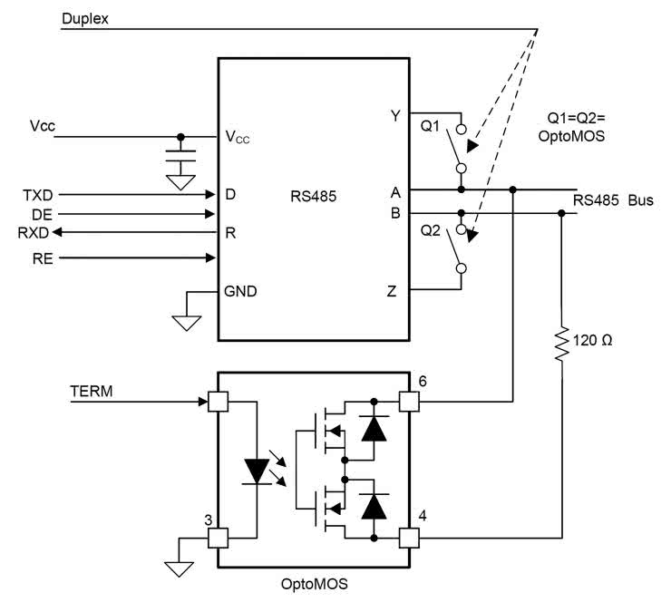 Projektanci systemów, próbując zaprojektować uniwersalną płytkę PCB z przełączalnym rezystorem terminatora, aby ta sama płytka PCB mogła być używana we wszystkich punktach sieci RS-485, mogą stosować przekaźniki optyczne, takie jak Opto-MOS. Elementy opto-MOS reagują na logiczny sygnał wejściowy i włączają lub wyłączają przełącznik półprzewodnikowy o niskiej rezystancji. Zasadniczo jest to funkcjonalne połączenie klucza MOSFET z transoptorem, zapewniającym izolację galwaniczną. Izolacja optyczna umożliwia pracę szyn interfejsu z dowolnym napięciem współbieżnym, niezależnie od sygnału odniesienia. Rysunek 5 pokazuje to rozwiązanie i rozszerza je o ideę przełącznika dupleksowości, co oznacza, że przy użyciu dwóch dodatkowych opto-MOS można zbudować rozwiązanie, które może działać jako half- oraz full-duplex, z włączoną lub wyłączoną terminacją.