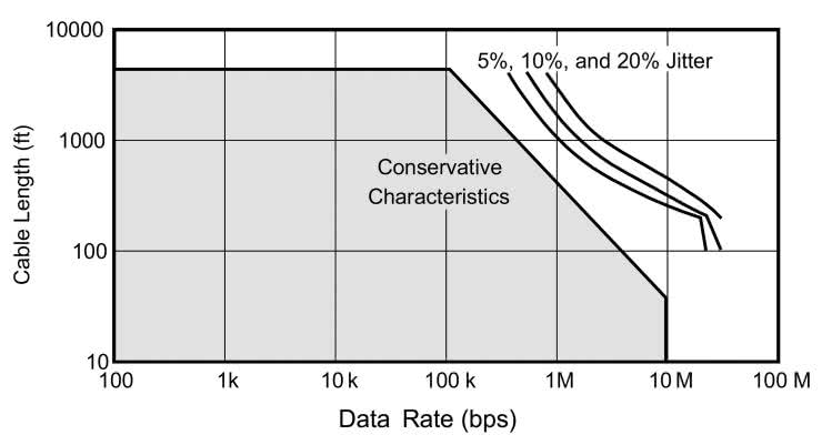 Standard RS-485 zapewnia pewne wytyczne dotyczące wyboru maksymalnej szybkości transmisji danych i długości sieci, jak pokazano na rysunku 4. Zależność między długością kabla a szybkością przesyłania sygnału określono dla różnych poziomów tolerowanego szumu fazowego sygnału (jitter). Linia ciągła to zachowawcze oszacowanie dla sygnału w zasadzie bez jittera. Długość sieci można zwiększać, jeśli system jest w stanie tolerować wyższy jitter w sygnale (5%, 10% i 20% jittera dla krzywych pokazanych na wykresie), a jednocześnie nadal jest w stanie prawidłowo rozróżnić wysokie i niskie bity.
