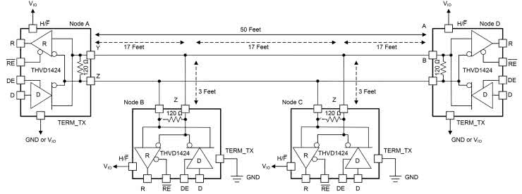 Czterowęzłowa sieć half-duplex została zbudowana przy użyciu skrętki dwużyłowej o długości 15,2 metra i czterech kart z układami THVD1424 połączonych w sposób pokazany na rysunku 11.