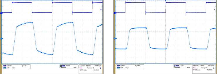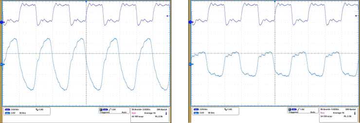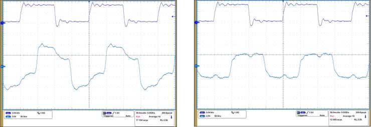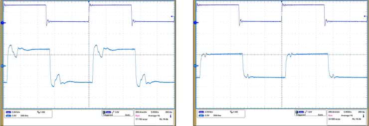 Pin kontroli prędkości narastania (SLR) dla każdego węzła został podłączony do masy, aby sprawdzić wpływ terminacji przy dużej prędkości. Węzeł B pracuje z prędkością 2 Mb/s (rysunek 12).