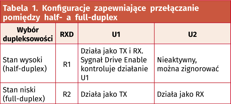 W tabeli 1 opisano stan układów dla obu konfiguracji. Z tym rozwiązaniem jest taki sam problem, jak z poprzednim, dyskretnym rozwiązaniem, zawierającym klucze Opto-MOS. Zajmuje ono sporo miejsca na płytce z uwagi na użycie dwóch scalonych transceiverów oraz dodatkowej logiki sterującej – łącznie co najmniej 4 układy scalone w tej sekcji.
