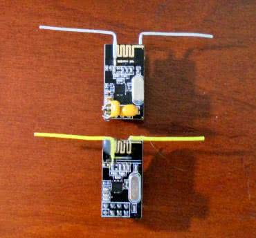 Warto też pamiętać, że anteny mikropaskowe stosowane w gotowych modułach radiowych mają wzmocnienie 4...8 dB, ale przy tym ów parametr zależy mocno od orientacji – zachowują się one nieco podobnie do anten kierunkowych. W dodatku nie każdy taki moduł został wykonany poprawnie. Dla przykładu wystarczy spojrzeć na popularne wśród hobbystów chińskie klony modułów z układem nRF24L01+ firmy Nordic. Transceivery te mają mocno ograniczony zasięg przez błędnie wykonaną antenę mikropaskową i źle dobrane elementy dopasowujące. Jeden z hobbystów, sfrustrowany zasięgiem wspomnianych układów, zmodyfikował swoje egzemplarze, dodając im prosty dipol (fotografia 1), co zwiększyło zasięg ponaddwukrotnie.