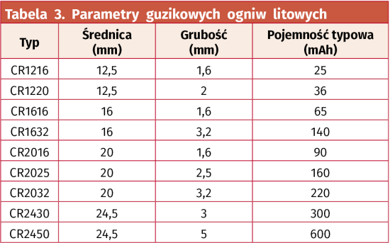 Warto spojrzeć jeszcze na rodzinę guzikowych baterii litowych, których oznaczenie zaczyna się od litery C. Baterie te są relatywnie tanie i występują w szerokiej gamie rozmiarów, a przy tym oferują wyższe napięcie zasilania. Tabela 3 prezentuje parametry ogniw tego typu w różnych rozmiarach. Napięcie nominalne wynosi 3 V, a napięcie ogniwa rozładowanego 2 V.
