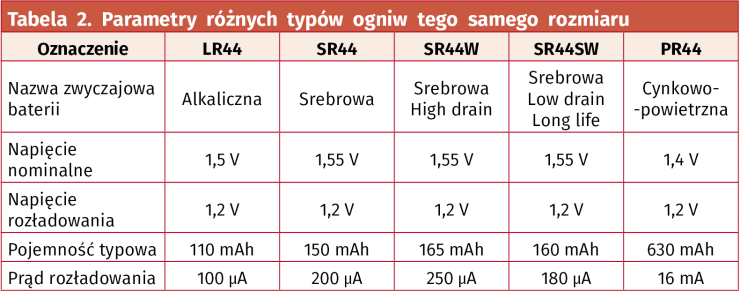 Drugą, bardzo popularną rodziną ogniw stosowanych w przenośnych urządzeniach, zwłaszcza gdy mają być one kompaktowe, stanowią baterie guzikowe, zwane też pastylkowymi lub zegarkowymi. Na rynku dostępne są liczne typy ogniw, różniące się użytymi materiałami elektrod oraz elektrolitu, co wpływa też na ich charakterystyczne napięcia i pojemności. Tabela 2 prezentuje porównanie ogniw jednego, popularnego rozmiaru R44, czyli 11,6 mm średnicy i 5,4 mm grubości. Prefiks określa typ, a opcjonalny sufiks dodatkowe właściwości.
