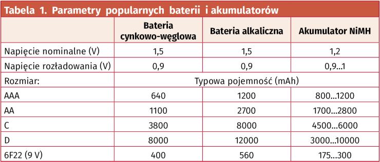 Zasilanie urządzenia z baterii lub akumulatorów wydaje się dość prostym rozwiązaniem. Na rynku nie brakuje ogniw o najróżniejszych kształtach, pojemnościach, napięciach i składach chemicznych. Temat jest na tyle obszerny, że można poświęcić mu nawet kilka artykułów, ale na nasze potrzeby wystarczy proste zestawienie kluczowych parametrów, by mieć jakie takie pojęcie o dostępnych opcjach. Zacznijmy zatem od najpopularniejszych typów baterii i akumulatorów (tabela 1).