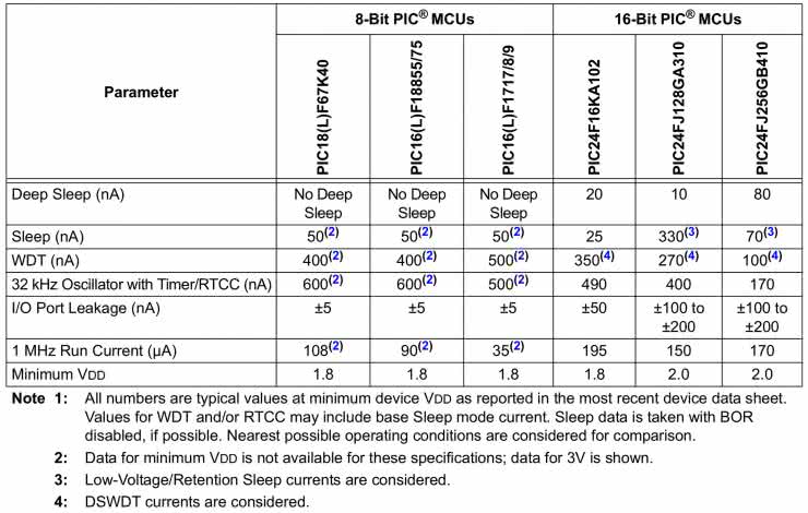 W ramach porównania wyliczony będzie średni pobór prądu przy napięciu zasilania 3 V lub 3,3 V (zależnie od tego, które dane są dostępne w notach) i dla różnych częstotliwości zegarowych dostępnych bez użycia zewnętrznego rezonatora. Ponieważ najwięcej doświadczenia mam z mikrokontrolerami firmy Microchip, właśnie one zostały wybrane do tych rozważań. Pobieżny przegląd not katalogowych procesorów różnych innych rodzin oraz producentów wskazuje na to, że nie ma między nimi dramatycznych różnic i w każdej rodzinie układów można znaleźć kilka dobrych alternatyw.