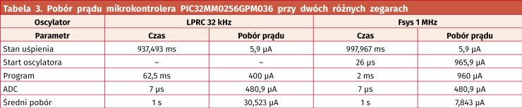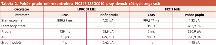 Układy z tej rodziny łączą w sobie rozbudowane peryferia analogowe z wieloma możliwościami oszczędzania energii. Dodatkowo Michrochip dodał sprzętową obsługę wyświetlaczy LCD, interfejs USB i dość szybkie CPU (16 MIPS) z hardware’ową realizacją mnożenia i dzielenia w jednym cyklu. Z naszego punktu widzenia użyteczną funkcją może być bateryjne podtrzymywanie pamięci oraz modułu RTCC. Tabela 2, ukazuje średni pobór prądu w przypadku naszego przykładowego programu korzystającego zegarów 31 kHz i 2 MHz przy napięciu zasilania 3,3 V.