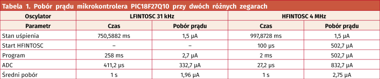 Przetwornik analogowo-cyfrowy potrzebuje 11TAD + 3TCY. TAD to czas jednego cyklu konwersji, w tym wypadku będzie to okres wewnętrznego oscylatora ADC, wynoszący typowo 2,2 μs. TCY jest natomiast czasem trwania jednej instrukcji, w przypadku LFINTOSC wynosi on 129 μs, a przy 4 MHz sięga 1 μs. Te liczby wynikają z faktu, że jedna instrukcja wykonuje się przez cztery cykle zegarowe. Musimy też doliczyć czas startu oscylatora HFINTOSC: 100 μs. Tabela 1 zawiera wyliczone czasy i pobór prądu na poszczególnych etapach pracy układu oraz uśrednione wartości natężenia prądu. Przy obliczaniu prądu uwzględniono też fakt, że zużycie go przez różne komponenty sumuje się, gdyż LFINTOSC nigdy się nie zatrzymuje (taktuje bowiem blok watchdog) i oba są używane przez ADC zależnie od ustawionej częstotliwości pracy. Średni pobór został wyliczony metodą pokazaną w poprzedniej części artykułu.