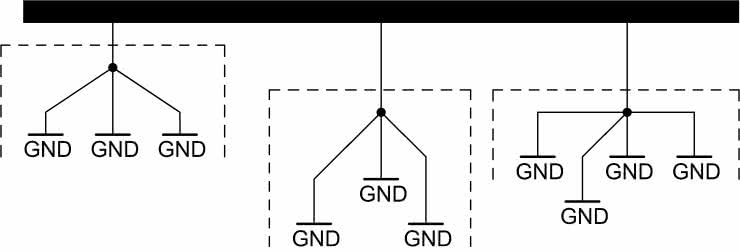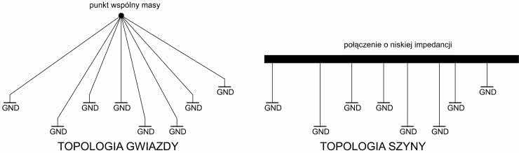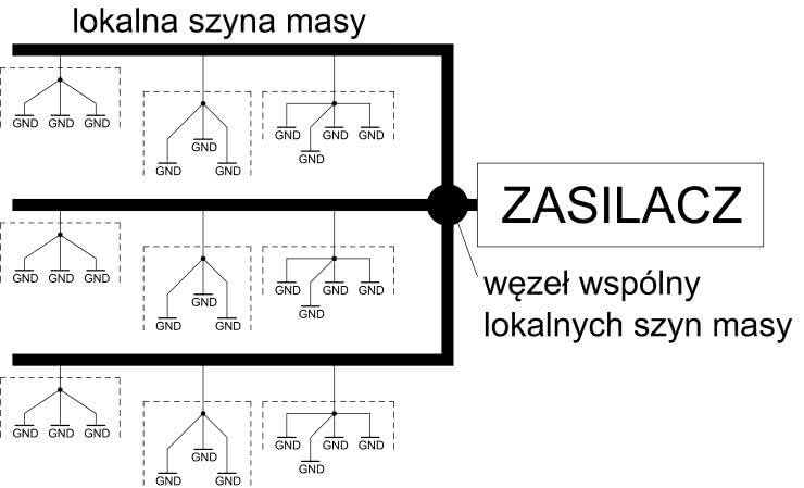 Po drugie, droga powrotna prądu między podzespołami, które są ze sobą blisko związane, wydłużyłaby się i to całkowicie niepotrzebnie. Topologia gwiazdy zawsze gwarantuje jednak, że nigdzie nie powstanie pętla masy – dowolnie wybrana para punktów mających potencjał zerowy łączy się bowiem między sobą tylko przez węzeł zbiorczy.