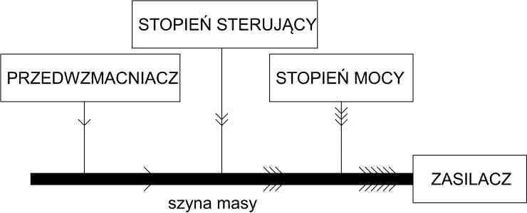 Dlaczego by zatem nie połączyć obu tych systemów? Gwiazda zapewnia nam eliminację pętli masy, z kolei szyna porządkuje rozpływ prądów tętnień. Można w ten sposób stworzyć system mieszany, w którym małe, lokalne gwiazdy masy łączymy przy użyciu szyny do zasilacza, co obrazuje rysunek 3.