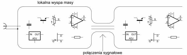 Takiej lokalnej gwiazdy masy nie trzeba rozumieć dosłownie. Gwiazda ma tę zaletę, że prądy błądzące nie spowodują przeniknięcia nadmiernych tętnień do np. przedwzmacniacza mikrofonowego. Ale taką lokalną gwiazdą może tez być wylewka – o ile tylko mamy gwarancję, że będą przez nią płynęły tylko te prądy, których sobie w jej obrębie życzymy. W tym obszarze może zatem znajdować się wzmacniacz operacyjny (lub inny element wzmacniający) ze swoimi kondensatorami odsprzęgającymi i podzespołami pracującymi w jego pętli sprzężenia zwrotnego. Mogą tam trafić również przynależne mu stabilizatory, jeżeli takowe są potrzebne, a opcjonalnie nawet złącze sygnału wejściowego (kierowanego do tego wzmacniacza) wraz z ewentualnym rezystorem terminującym – i tyle, nic więcej. Wylewka masy jest dzisiaj łatwiejsza do uzyskania na powierzchni obwodu drukowanego niż gwiazda, poza tym pełni również funkcję ekranującą elementy przed działaniem zewnętrznego pola elektromagnetycznego (głównie przed składową elektryczną, z racji wykonania jej z będącej diamagnetykiem miedzi).