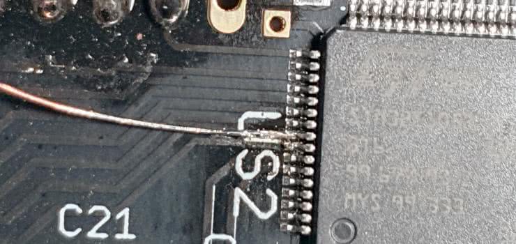 Mój osobisty faworyt w tym zakresie to cienka srebrzanka (mam kilka szpulek o różnych średnicach), ponieważ łatwo można ją dolutować nawet wprost do wyprowadzenia układu scalonego czy innego podzespołu. Do obudów z wąskimi nóżkami, jak TQFP64, który jest już przylutowany do powierzchni płytki, stosuję z kolei pojedyncze miedziane włoski, uzyskane w wyniku zdjęcia izolacji z jednej żyły typu linka. Taki włosek wystarczy tylko pocynować, po czym przyłożyć do odpowiedniego wyprowadzenia i docisnąć gorącym grotem – fotografia 1. Można w ten sposób uratować prototyp, kiedy jakieś wyprowadzenie układu scalonego zostało pomylone – lub jego funkcja źle zinterpretowana. Miedziane włoski mają tę przewagę nad srebrzanką, że są od niej elastyczniejsze, co utrudnia odłamanie ich od miejsca przylutowania, które ma przecież niewielką powierzchnię. Na koniec warto owo miejsce wyczyścić (chociaż zgrubnie) z kalafonii i zalać żywicą epoksydową w celu wzmocnienia.