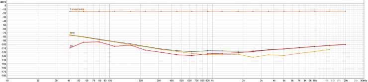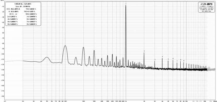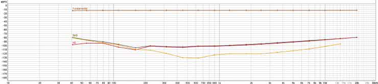 Widać tu wyraźny wzrost dla częstotliwości powyżej 2 kHz. Nasze pomiary niezbyt się z tym zgadzają, bo sam pomiar karty wykazuje większe zniekształcenia dla niskich częstotliwości, które nakładają się na pomiar wzmacniacza.