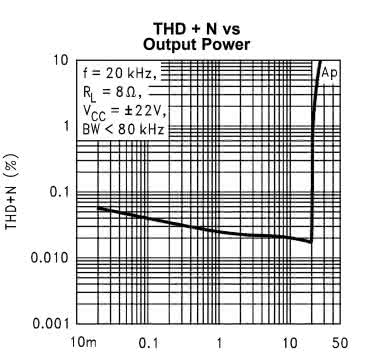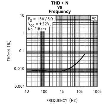 Jak widać, wykres THD+N wzmacniacza podąża za wykresem karty. W danych katalogowych możemy znaleźć wykres zależności THD+N w funkcji częstotliwości – rysunek 33.
