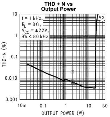 - Zniekształcenia przy 2 W podane przez producenta układu THD+N: 0,007%,