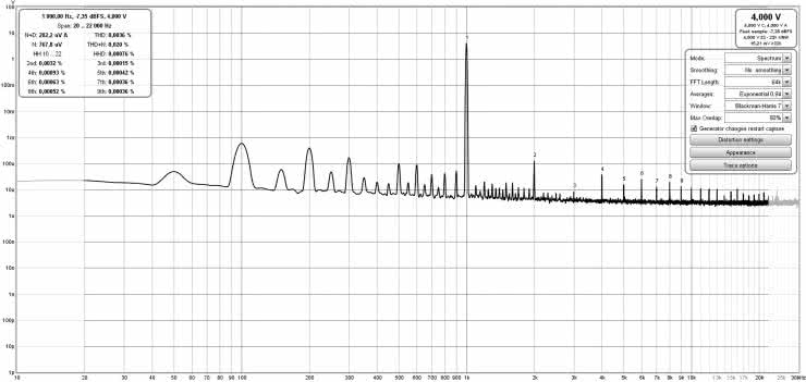Dla sygnału 1 kHz na poziomie 4 V (RMS) składowa 50 Hz ma wartość RMS ok. 850 μV. Ten parametr pokazuje skalę wspomnianego wcześniej zakłócenia: jego efekt w żadnym razie nie powinien być słyszalny w postaci brumu.