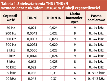 Widać tu wyraźną dominację parzystych harmonicznych, co w przypadku układów wzmacniaczy audio jest pożądane. Przyjmuje się, że brzmienie wzmacniacza, który ma dominację parzystych harmonicznych, jest naturalniejsze i cieplejsze. Tak dzieje się we wzmacniaczach lampowych SE, uznawanych przez wielu za najlepiej brzmiące. Podobnie bywa (choć nie jest to regułą) we wzmacniaczach lampowych push-pull klasy AB, pracujących z małymi mocami, z kolei we wzmacniaczach tranzystorowych bywa z tym różnie. Widać, że konstruktorzy układu LM1876 postarali się, aby układ mógł brzmieć dobrze.