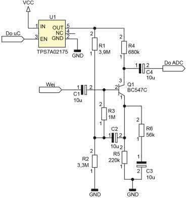 Czytelnik zauważy, że wartości rezystorów są znacznie wyższe niż zazwyczaj spotykane w takich układach. Właśnie dzięki temu ograniczono pobór prądu kosztem wyższej impedancji wyjściowej. By przy okazji poprawić impedancję wejściową, zastosowano bootstrap składający się z R3 i C2. Amplituda sygnału wejściowego jest ograniczona przez napięcie zasilania do około 80 mV p-p, na wyjściu wyniesie zatem 800 mV p-p. Przetworniki ADC mikrokontrolerów z reguły potrzebują źródła sygnału o impedancji do 10 kΩ, ale to prawda przy założeniu maksymalnej częstotliwości próbkowania – źródło musi mieć na tyle wysoką wydajność prądową, by zdążyć przeładować kondensator próbkujący o wartości kilku do kilkunastu pikofaradów. Rysunek 2 pokazuje zmodyfikowany wariant układu z dodatkowym tranzystorem. Pobór prądu rośnie do około 3,5 μA, ale amplituda sygnału wyjściowego może już osiągnąć wartość 1 Vp-p przy jednoczesnym obniżeniu impedancji wyjściowej. Pasmo przenoszenia sięga 30 kHz.