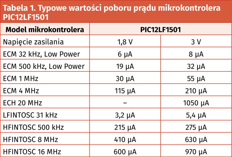 Z reguły wewnętrzny oscylator mikrokontrolera ma tylko kilka do kilkunastu stałych częstotliwości, najczęściej każda jest 2 razy większa od poprzedniej. Jeśli zatem potrzebujemy częstotliwości niestandardowej, to jedyną opcją staje się zewnętrzny rezonator lub generator kwarcowy. Noty katalogowe nie podają zwykle dolnego limitu częstotliwości taktowania, więc w teorii układ może pracować z dowolnie niską częstotliwością, nawet rzędu pojedynczych herców, co ma też wpływ na pobór prądu. W celu miarodajnego porównania, w tabelach 1 i 2 zestawiono typowe pobory prądu dwóch mikrokontrolerów: PIC12LF1501 oraz PIC18LF45K50 przy różnych częstotliwościach i typach oscylatorów.