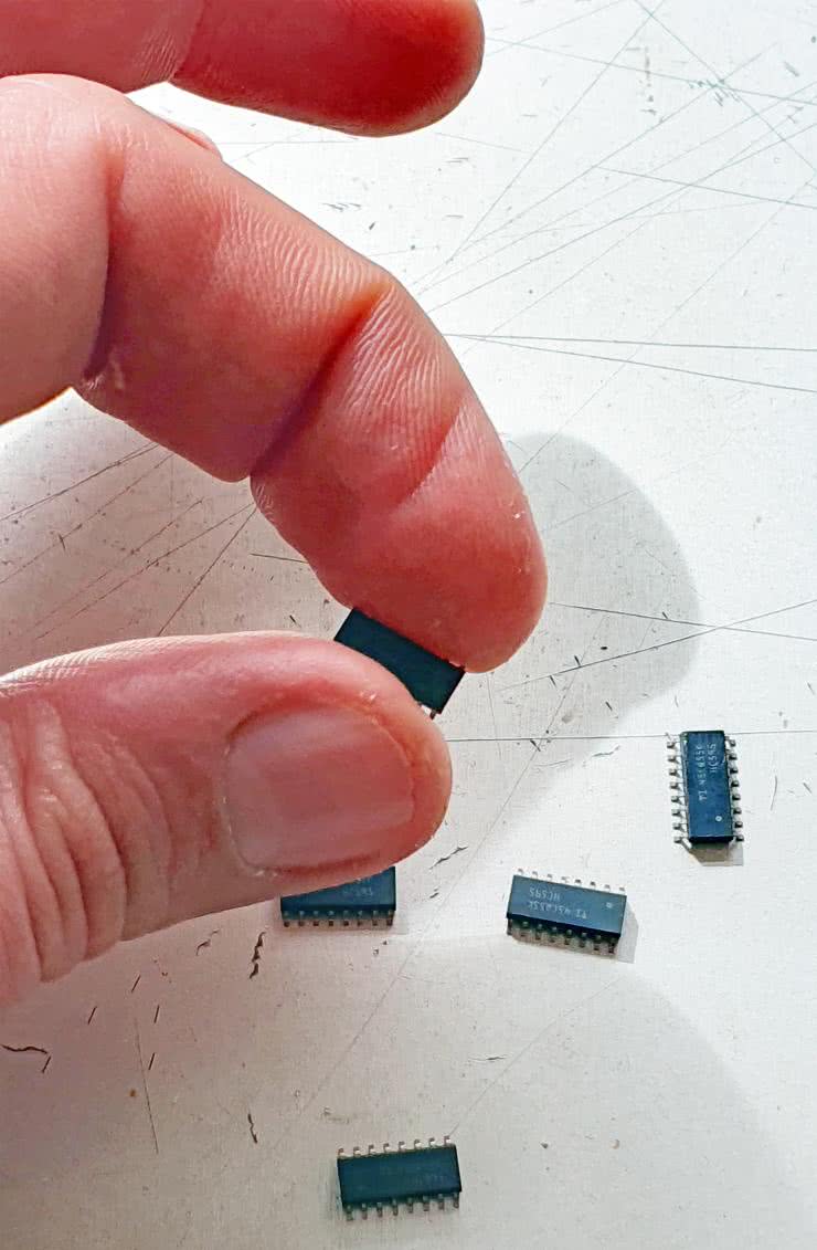 Ostatnia rzecz, która mocno zadziwia innych, to chwytanie przeze mnie układów w palce – przy czym staram się dotknąć jednocześnie jak największej liczny nóżek, o ile one w ogóle wystają poza obrys obudowy. Wysypuję z szufladki kilkanaście scalaków, po czym odwracam je w pożądaną stronę, po prostu biorąc je w dłonie, jak na fotografii 4.