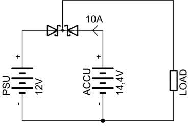 Jako przykład do dalszej analizy proponuję następującą sytuację: dwa źródła napięcia o wartości około 12 V (akumulator żelowy, doładowywany przez OZE, a także zasilacz sieciowy) mają za zadanie zasilać system kamer, pobierający prąd o natężeniu około 10 A. Źródła napięcia są dwa, odbiornik zaś jeden – trzeba wybrać to, które aktualnie ma najwyższe napięcie i to z niego czerpać energię. Akumulator 12 V ma z reguły napięcie wyższe niż zasilacz 12 V, bo wynoszące około 14,4 V, więc przez większość czasu to ten pierwszy będzie dostarczał energii. Dopiero kiedy ulegnie znacznemu rozładowaniu, układ przełączy system kamer na pracę z zasilacza.
